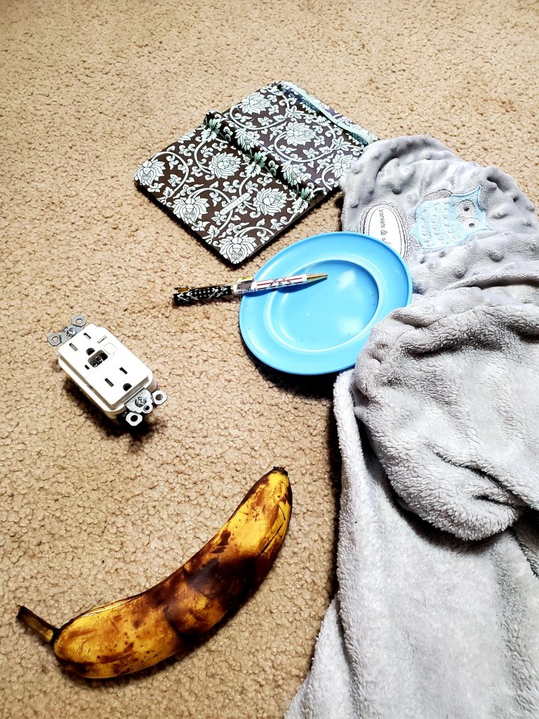 On the floor, right in front of me – theres a banana, address book, pen, plate, blanket, and outlet. WHAT IN THE ACTUAL EFFING-HELL?
