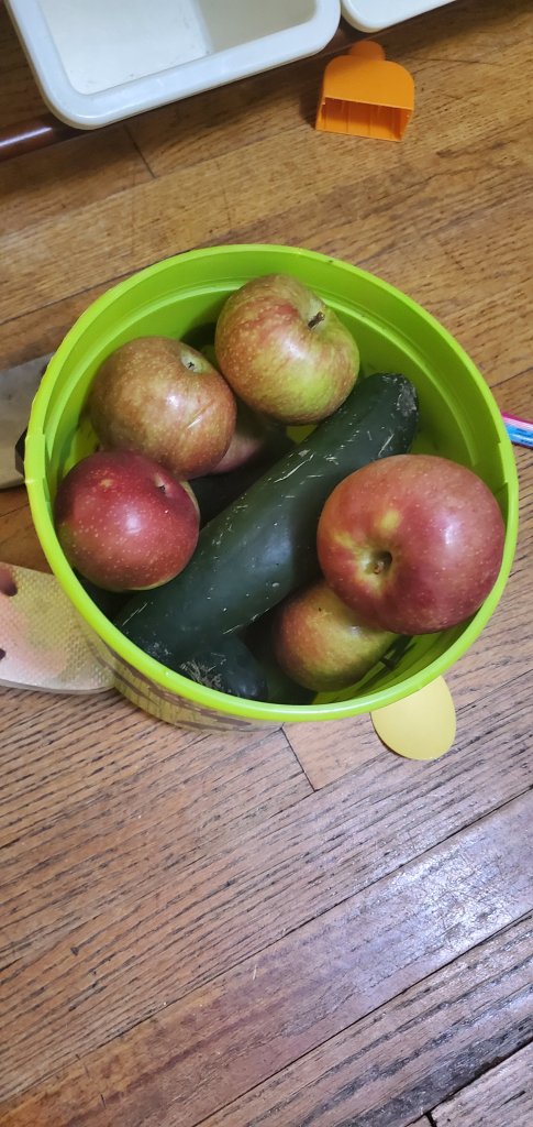 Once I hang up the phone, I realize that in addition to the applesauce, he seems to have helped himself to four cucumbers and a Halloween-bucket-full of apples. I can only assume he was saving these for later crafting use, as I found the bucket stashed away in his bedroom.