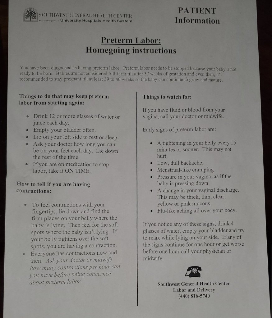 As relieved as we are, my OB still instructed me to listen to my body. She told me if contractions persist every 10 minutes, I should take my butt back to the hospital. AND, bonus! I was given a fact sheet on preterm labor.
