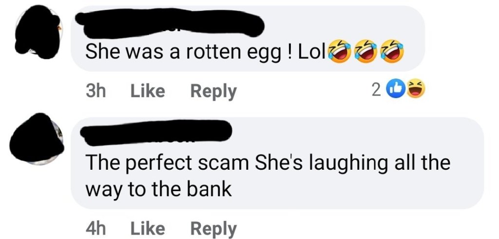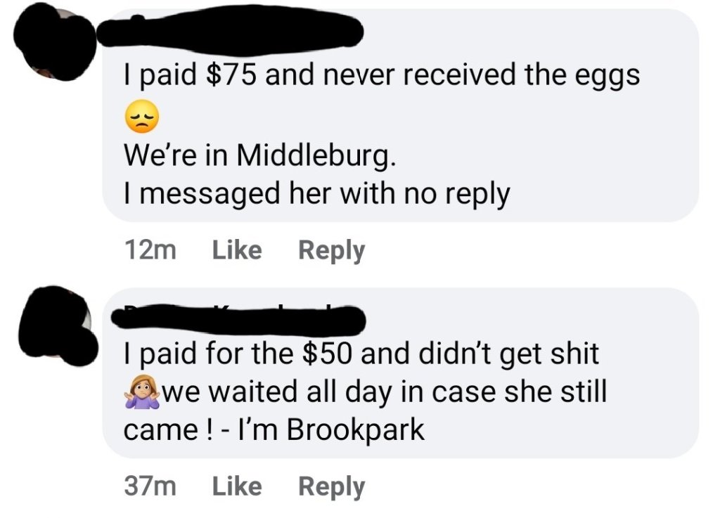 The other side of the story? The egg woman in question swears it’s all a big misunderstanding. Basically, she was overwhelmed, short-staffed, etc….She’s also publicly stated (via Facebook) that she’s making her way through the customers list, and reaching out to make it right.