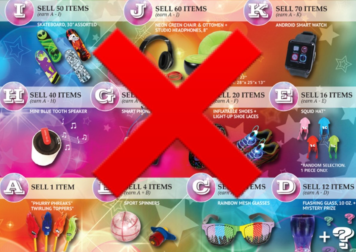Gimmicks are a thing now. Not only is there the famous prize sheet. Nope. Now, we’re also offering our kids vacations and a PS5. BUT, the catch is, you’ve got to sell a minimum of ten items, totalling more than $150, sacrifice a lamb, and then you are ENTERED in a drawing to win. Only 1 out of every single student in the entire country, and maybe even US territories, will win.