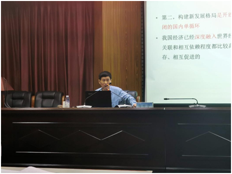 讲座上,郑传芳教授简要概述了《中共中央关于制定国民经济和社会发展第十四个五年规划和二〇三五年远景目标的建议》(以下简称《建议》)的起草过程,结合党的十九届五中全会《建议》的内容,总结出其主要特点,赞美我们党在面对更多逆风逆水的外部困难环境中,勇于开顶风船的不畏艰难险阻奋勇前进的英勇气概。“我自岿然不动”、“这边风景独好”,“总要力争隔几年上一个台阶”,面对开启全面建设社会主义现代化国家新征程的局面,郑传芳教授引用毛泽东、邓小平语录,表明在面对中美贸易战、技术封锁等国际问题时中国所持有的态度与决心。