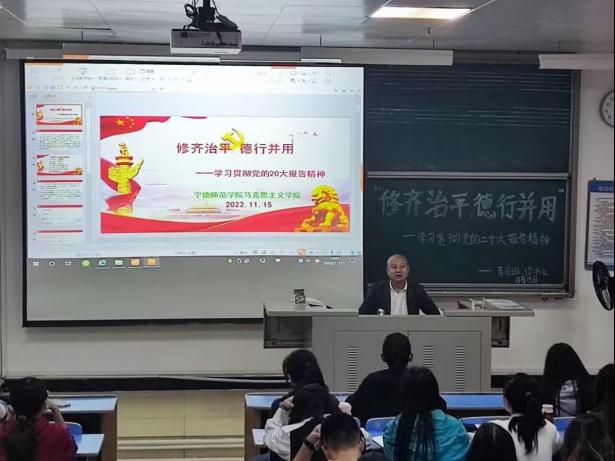 本次讲座内容分为解读党的二十大报告原文和阐释党的二十大精神与中华优秀传统文化“修齐治平,德行并用”关系两个部分。讲座伊始,周维功教授点明习近平总书记在大会上作的报告主题鲜明,继往开来,闪烁着马克思主义的真理光辉,“是政治宣言书,更是战斗冲锋号”。报告全面总结了过去五年的工作和新时代十年的伟大变革,深刻阐释了新时代坚持和发展中国特色社会主义的一系列重大理论和实践问题,描绘了全面建设社会主义现代化国家、全面推进中华民族伟大复兴的宏伟蓝图,为新时代新征程党和国家事业发展、实现第二个百年奋斗目标指明了前进方向、确立了行动指南,具有极为重大而深远的指导意义。周维功教授不仅重点提到“青年强,则国家强。当代中国青年生逢其时,施展才干的舞台无比广阔,实现梦想的前景无比光明”,而且进一步阐明“让青春在全面建设社会主义现代化国家的火热实践中绽放绚烂之花”的重要意义,勉励同学们勇立新时代发展浪潮之上,施展才干,承担责任,肩负使命。
