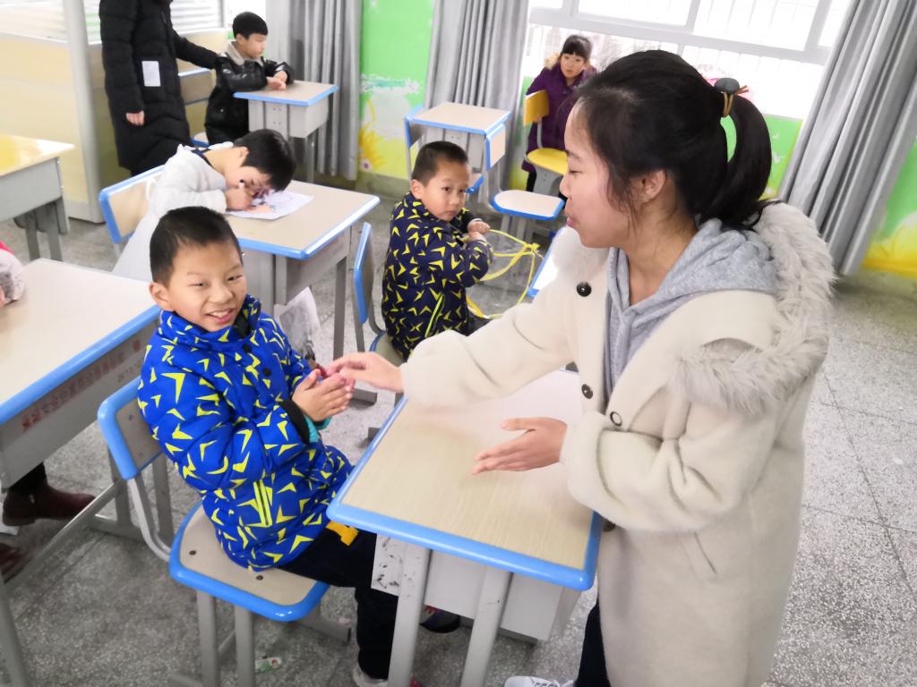 此外,在课间志愿服务队的成员们还积极和孩子们进行互动,通过 “开火车”、“木头人”等游戏,充分调动孩子们的积极性,从而让特教学校的孩子们可以更好的彼此熟悉,更好的形成一个团结的整体。
