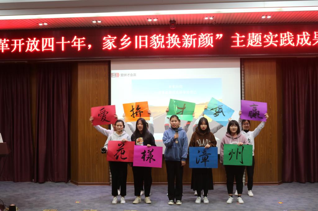 此次汇报会每组共有8分钟的展示时间。展示团队通过情景剧、PPT、朗诵等多种形式展示调研结果。教育院团队通过今日聚焦栏目展示了人们对自己家乡变化的看法;漳州组的朗诵节目《花样漳州》介绍了漳州的美丽风景,一曲《爱拼才会赢》唱出了闽南人民艰苦奋斗的精神;贵州组采用方言情景对话的形式,反映贵州人民改革开放以来生活的变化;福厦组运用导游的形式介绍了福州、厦门的美景及变化;河南组通过“公交车”上的对话,展现出改革开放后人们思想观念的变化;医学院团队运用PPT展示了宁德寿宁县四十年来的变迁;新疆组结合新疆特色歌舞,声情并茂地介绍了新疆改革开放四十年来的发展;泉州组展示了永春、惠安、晋江三地的变化与发展,同时融合了琵琶、茶艺等文化元素。