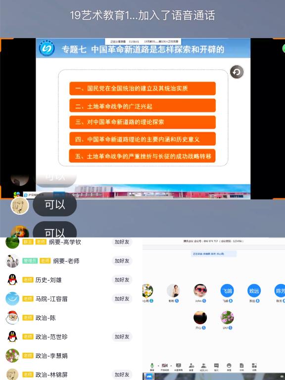 高学钦老师于4月20日3、4节开展了一次《近现代史纲要》的公开课。高老师也是用QQ群分享屏幕的方式开展教学,他讲课的主题是:中国革命新道路是怎样探索和开辟的,从国民党统治的实质到土地革命战争的广泛开展,他用许多历史故事与历史的案例深入浅出的带领同学们了解这一时期的历史,员工分别在QQ群里给予回应,互动良好。晚上七点半,召开腾讯视频评课会议,这次评课与政教专业的林锦屏老师与彬彬老师的公开课合在一起