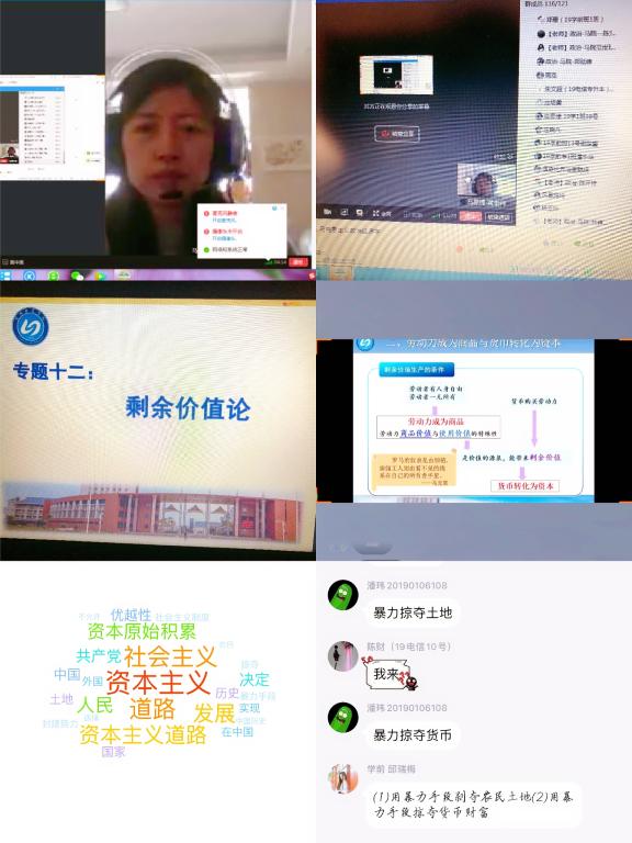 黄玉桃老师于4月14日(周二)3、4节率先在18级《马克思主义基本原理概论》课上了一次公开课,她用QQ群进行分享屏幕教学,并配套使用学习通的互动功能,从签到、选人、课堂讨论、员工连线等互动方式对马克思剩余价值理论进行了层次递进的分析与阐述。员工互动积极,讨论热烈。十多位思政教师参与了课堂活动。下午3点,由黄玉桃老师发起腾讯视频会议,组织老师进行线上评课活动,针对线上如何更好的加强师生互动展开讨论,并对公开课存在的不足提出建议。