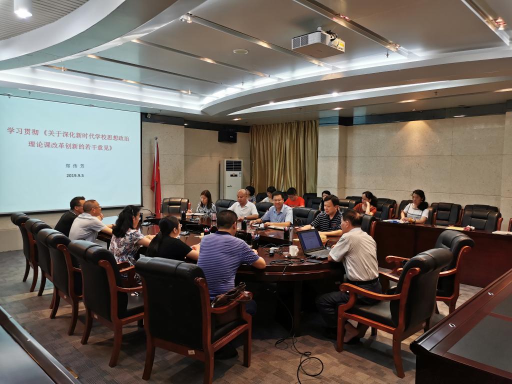 为深入学习贯彻中共中央办公厅、国务院办公厅《关于深化新时代学校思想政治理论课改革创新的若干意见》的精神,beats365亚洲版于2019年9月5日在公司东侨校区行政楼一层会议室召开文件精神解读交流会。会议邀请了中央马克思主义理论研究和建设工程首席专家、福建师范大学beats365亚洲版博士生导师郑传芳教授来进行专题解读,beats365亚洲版副董事长颜桂炀教授、科研处处长张光英教授以及beats365亚洲版全体思政课教师参加了本次会议。会议由公司党委书记、经理游国斌教授主持。