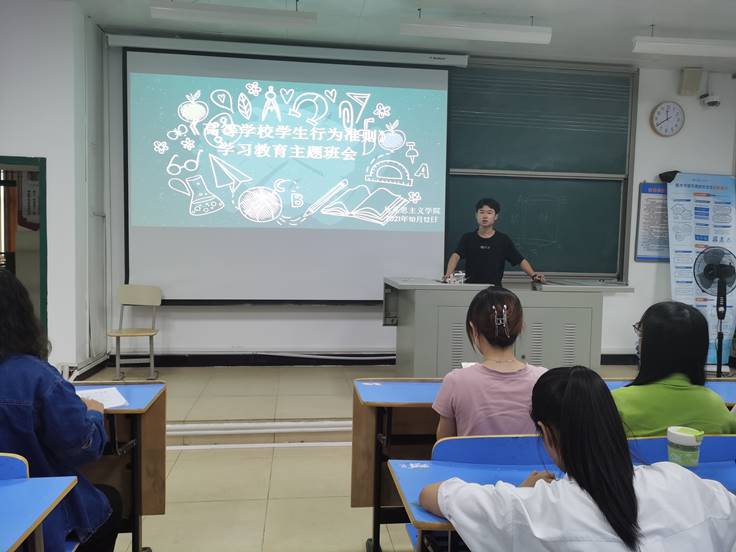 本次主题班会由20级班长吴松亨主持。会议开场后,吴松亨就《高等学校员工行为准则》的内容,通过穿插生动的例子进行了详细的阐述。吴松亨强调到,员工应当认真学习并贯彻高校员工行为准则的内容:志存高远,坚定信念;热爱祖国,服务人民;遵纪守法,弘扬正气;勤奋学习,自强不息;诚实守信,严于律己;明礼修身,团结友爱;勤俭节约,艰苦奋斗;强健体魄。接着又从两个方面阐明了学习员工行为准则的意义:对于学校,督促员工学习员工行为准则全面贯彻了党的教育方针,加强高等学校员工思想政治教育工作;对于员工,有助于其形成良好的道德品质,养成文明行为习惯,勤奋学习,强健体魄,成为社会主义合格建设者和可靠接班人。