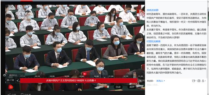 百年征程铁心向党,青春激扬复兴伟业。为庆祝中国共产主义青年团成立100周年,重温一百年来中国青年运动的光辉历程,继承和发扬伟大五四精神,鼓舞和激励新时代中国青年踔厉奋发、笃行不怠,5月10日上午,公司“青马工程”和“读书社”学员们观看“中国共产主义青年团成立100周年”庆祝大会直播,认真学习习近平总书记重要讲话精神。