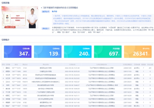 2022年9月2日,经超星集团专家评审,该线上课程被评为优质课程并收录为“示范教学包”。之后在短短4天时间里,全国139所高校共计240名思政课教师同行引用该课程“示范教学包”进行建课次数已达到347次,陈开梓老师所建线上课程已得到同行的高度认可与评价,并有望在新的学期里成为全国思政同行引用建课的“网红打卡包”。