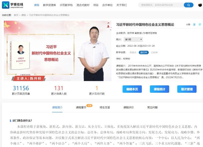 2022年9月6日,经过层层推荐与审核,陈开梓老师建设的《习近平新时代中国特色社会主义思想概论》已正式登陆“学银在线”,成功上线国家精品在线开放课程评选和运营平台(网址:https://www.xueyinonline.com/detail/227110454),已将课程建设影响力辐射全国,彰显了线上教学成果的推广应用效果。