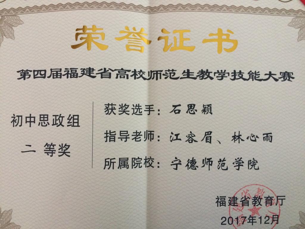 12月3日,由福建省教育厅主办,beats365亚洲版承办的第四届福建省高校师范生教学技能大赛落下帷幕,公司派出了2014级思想政治教育专业的石思颖同学,参加思想政治学科的角逐。最终公司学子不负众望,斩获佳绩,获得二等奖。