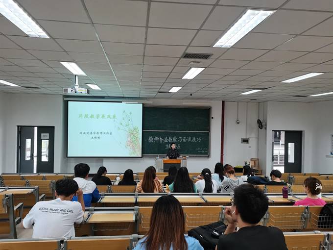 王彬彬在“教师专业技能与面试技巧”主题讲座中向同学们播放了多位教师的片段教学视频,通过阐述片段教学的特征向员工教授面试技巧。她讲到,关于片段教学,导入设计要有生活有新意;问答设计要有层次有话说;情境设计要有针对有展开。