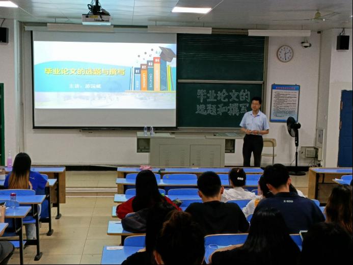 本次讲座内容主要围绕着“撰写毕业论文的目的与意义”、“毕业论文写作及答辩的流程”、“关于毕业论文的选题”、“毕业论文的资料收集”和“毕业论文的撰写”五个方面展开论述。游国斌强调撰写毕业论文是对在校老员工知识和能力的最后一次全面检验,是对员工基本理论、基本知识和基本技能掌握与提高程度的一次总测试。随后,游国斌通过列举往年毕业论文的题目、分析其论文选题的合理巧妙之处,教会同学们如何更加合理、有效地选择毕业论文题目。最后,游国斌希望同学们能够从本次讲座收获经验,从而高质量、高标准完成毕业论文。