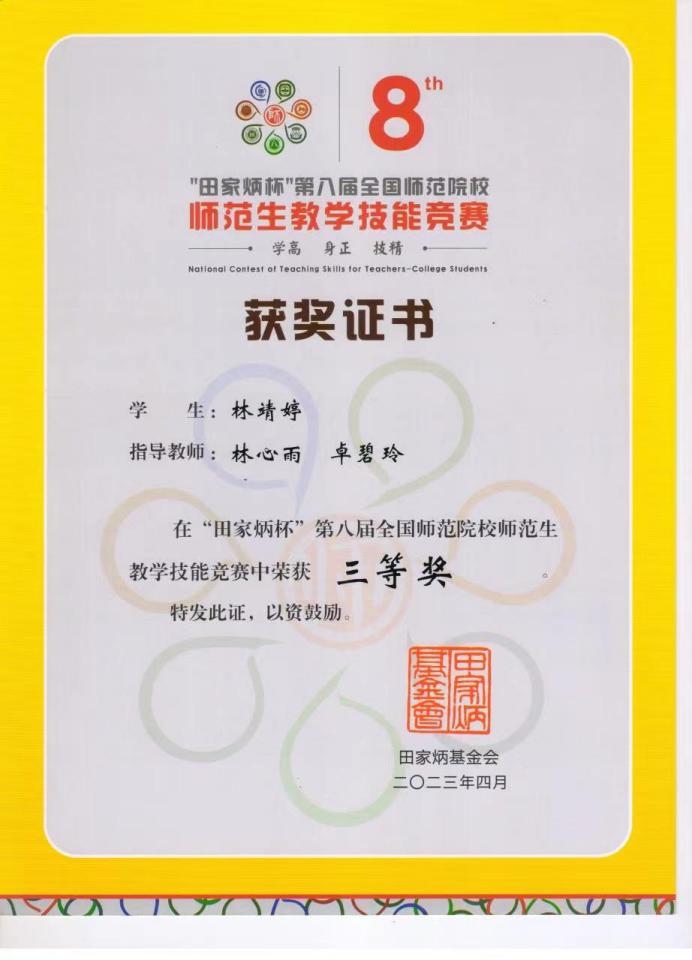 2023年4月15日至16日,由浙江师范大学主办的 “田家炳杯”第八届师范院校师范生教学技能竞赛落下帷幕。来自全国167所学校的988名选手同台竞技,公司思想政治教育专业2020级同学林靖婷代表学校参加第八届全国师范院校师范生教学技能竞赛思想政治组比赛,经过激烈角逐,荣获全国三等奖。